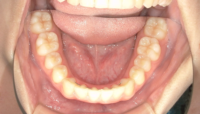 ワイヤー矯正の場合、片側抜歯を行うと正中のライン(真ん中を通るラインのこと)が抜歯した方向へ流れてしまうことがありますが、今回は熟練した矯正医の元マウスピース型矯正装置(インビザライン)を行ったため、そのような反作用は生じませんでした。